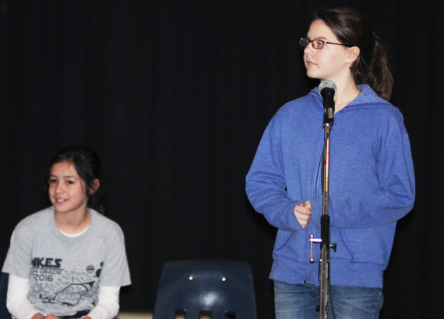 New Kent Middle School seventh grader Noelle Kruger (at the microphone) anticipates her next word while New Kent Elementary School fifth grader Kendall Hicks awaits her turn during the final rounds of Friday's New Kent County Public Schools annual Spelling Bee. Nine grade group spelling champions started the competition, which came down to Noelle and Kendall vying for the crown. Noelle won the event by correctly spelling "discern" in the 10th round. Kendall finished as runner-up. Noelle advances to the regional bee scheduled for March 12 at the Library of Virginia in Richmond.Alan Chamberlain photo