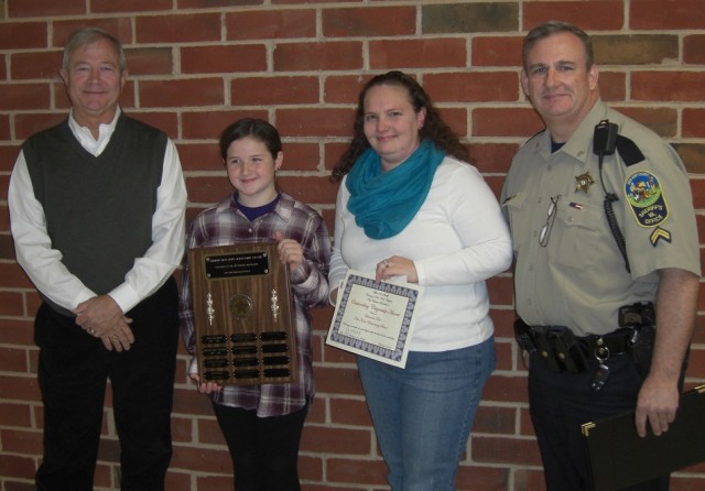 New Kent Sheriff’s Office and the Kip Kephart Foundation presented their annual Good Citizenship Award to three students who attend New Kent County schools. Each student was recognized for his or her contributions to the school and community and will have their name engraved on a plaque. Above, Amanda Ford (second from left) is recognized as New Kent Elementary School’s winner. She is accompanied by (l to r) Steve Rula of the Kip Kephart Foundation, her mother Beth Ford, and Corporal Kevin Watkins of New Kent Sheriff’s Office.