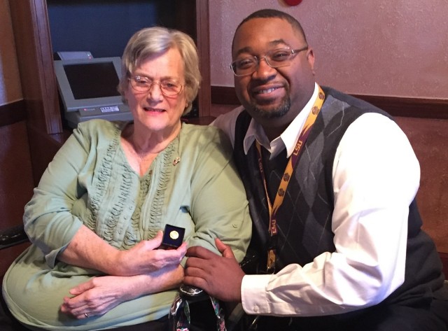 Laverne Shaffer (left) is the recipient of the Paul Harris Award presented by New Kent Rotary. The award is given to a member of the organization who displays ongoing support, contributions and assistance to the club. Presenting her the award is New Kent Rotary President Dwight Johnson (right).