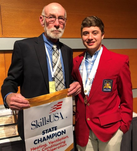Michael Foster (right), a senior at New Kent High School and student at Bridging Community Career and Technical Center, won the SkillsUSA state competition in the HVAC category during the weekend of Apr. 21 in Virginia Beach. As the winner, he received a $10,000 scholarship and will be traveling to Louisville, Kentucky, to compete in the national competition in June. Accompanying Michael is HVAC instructor Tom Fowler.