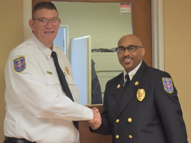 Charles City Director of Fire and EMS James Johnson (right) welcomes Captain George Bridges (left) as part of swearing in ceremonies that took place Monday morning at the Charles City Government and Administration building. The two will assist with the continuing transition of Charles City County having paid firefighters and EMS staff to serve citizens in emergency situations.Robb Johnson photo