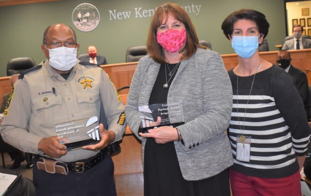 New Kent Deputy James Sidney Burrell Sr. (left), New Kent Victim Advocate Karen Mortensen (center), and interim director of social services Susan Grey (right) were recognized during Monday evening’s New Kent Board of Supervisors’ meeting. Burrell was recognized for more than 30 years of service to New Kent County in a variety of agencies, while Mortensen and Grey were honored for their contributions to the Bridges of Change, an organization that provides shelter to victims of domestic abuse.Robb Johnson photo
