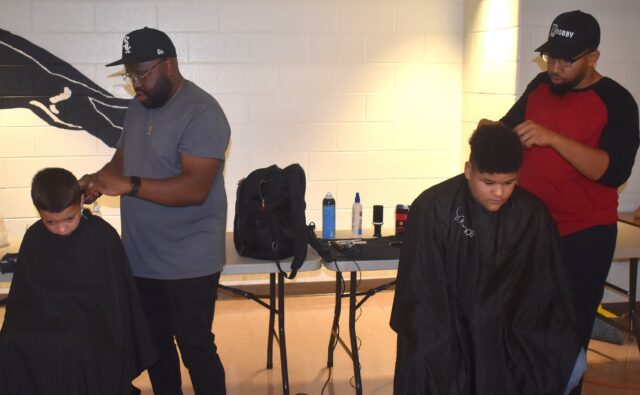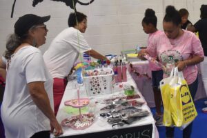 Above, kids get free haircuts and styles as part of Charles City County Public Schools “Back-to-School” event held Saturday morning at the high school. The event is used as an introduction for students to become reacclimated to the learning environment as they received supplies, goodies, and also had a chance to explore the Charles City Farmer’s Market. Below, parents and students are able to gather supplies and fashion accessories from The AKA Shop’s table as part of the rally. Robb Johnson photos