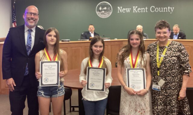 New Kent Middle School students were recognized for their excelling in the National Spanish Exam, earning medals as part of their achievement. Pictured are (center, l to r) Chloe Smolnik (Honorable Mention), Kirsten Adkins (Honorable Mention), and Janela Emery (Silver Medalist). Not pictured is Jonathan Cruz.Robb Johnson photo