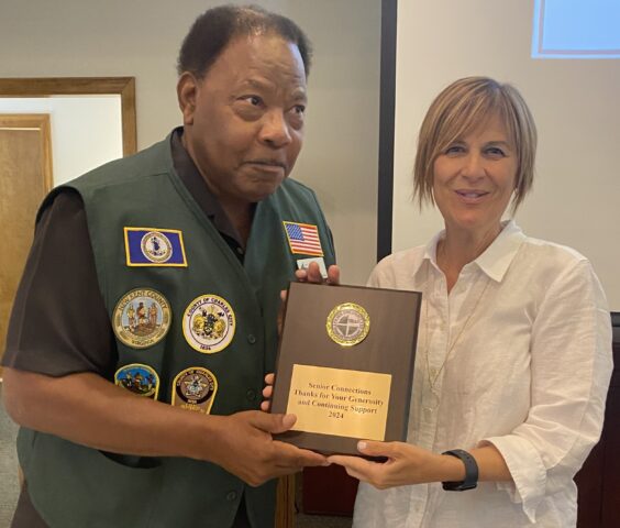 Chickahominy Triad chairman Danny Green (left) presents a plaque to Senior Connections Executive Director Amy Strite (right) as part of a July 10 recognition. The plaque is presented as a token of appreciation as both entities share beliefs and goals to enhance the lives of the aging population.