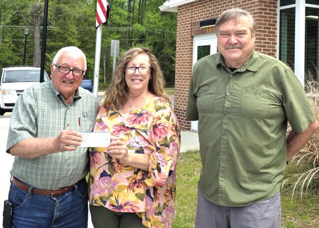 Free Hunters Hunt Club representatives Earl Slone (left) and Rick Chisholm (right), located in New Kent, make a donation to Bridges of Change during an Apr. 23 presentation. The organization raises funds and makes donations to charitable groups as an initiative to support those who continuously provide services and support those in need.