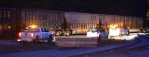 CSX officials and crew members inspect the remaining cars on the track during the evening hours after the crash.Robb Johnson photo