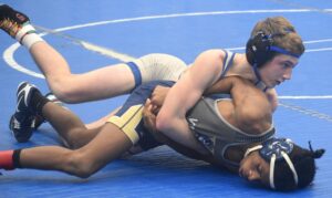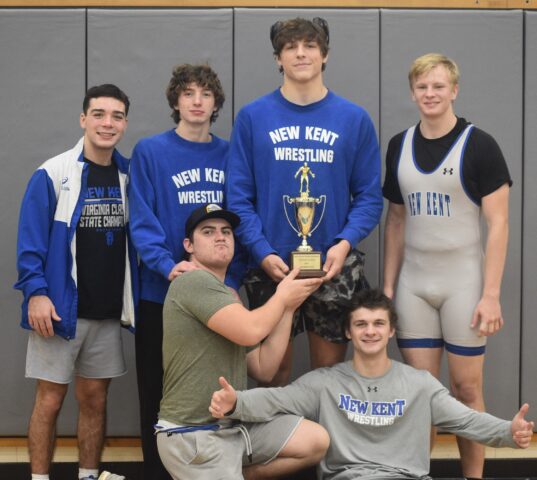New Kent High School’s wrestling team with 5-0 in their annual Trojan Duals on Saturday Dec. 3. The team earned wins over Hanover (73-6), Atlee (61-15), Landstown (48-24), Orange (62-14), and Varina (69-9). Below, New Kent’s Sam Stamper applies a lock on a Varina opponent as he maintains leverage in his victory in the 113-pound weight class.Robb Johnson photos