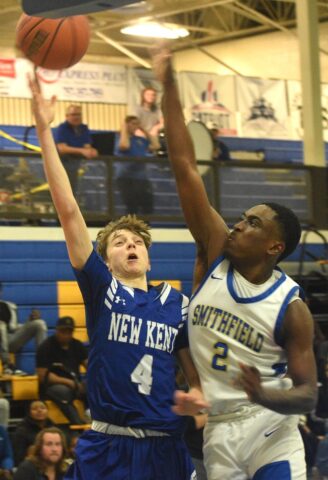 New Kent’s Will Ross (4) is challenged by Smithfield’s Kevin Parker Jr. (2) on a tough drive to the basket.Robb Johnson photo