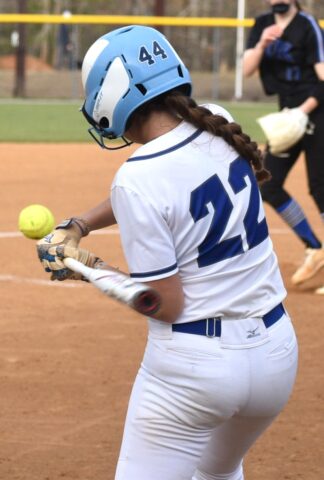 New Kent’s Hannah Perkins (22) fights off an inside pitch that resulted into a triple that sparked a Lady Trojans rally in the sixth inning.Robb Johnson photo