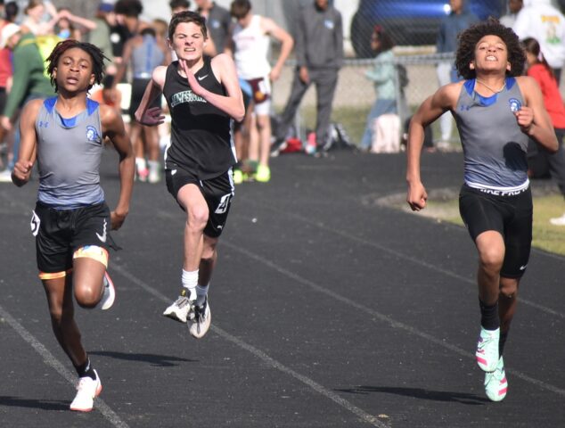 New Kent’s Kingston Young (left) and Jordan Carr (right) speed out the gate away from Jamestown’s Luca Benevente in the third heat of the boys’ 100-meter dash.Robb Johnson photo