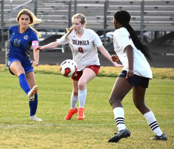 Lady Trojan Kaitlyn Drake (11) launches a shot around Colonial Heights defender Mackensie Stratton (6) and goalkeeper Sacajawea Thweatt (right) to complete a hat trick.Robb Johnson photo