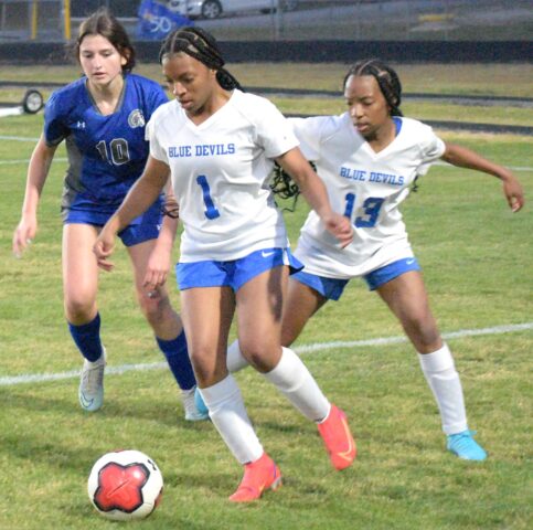 Hopewell’s Amiya Reese-Banks (1) and Fajardo Mabelyn (13) try to scheme to prevent New Kent’s Michelle Drake (10) from stealing the ball from them.Robb Johnson photo