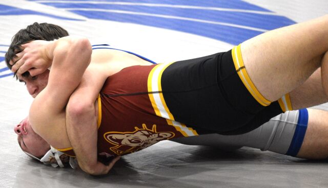 New Kent’s Chase Wiles battles it out with a Nottoway grappler during a pinfall attempt.Robb Johnson photo