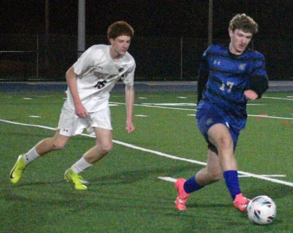 New Kent’s Mason Phaup (17) plays keep away with the ball as Poquoson’s Daniel Simmons (15) gives chase.Robb Johnson photo