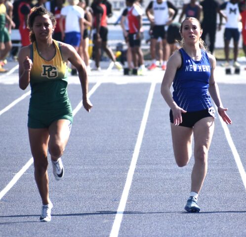 New Kent’s Brooklyn Wiles (right) tries to keep up with Prince George’s Taleah Allen (left) in the final heat of the girls’ 100-meter dash. Wiles placed third overall in the event.Robb Johnson photo