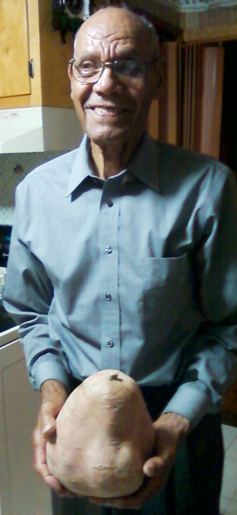Stanley S. Cotman of Charles City proudly displays an eight-pound sweet potato he grew this season in his home garden.