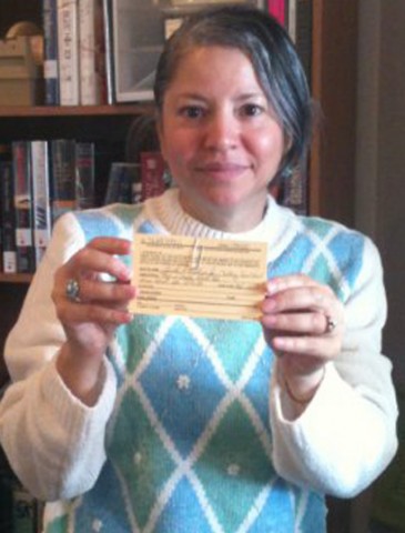 Heritage Public Library worker Paulette Johnson holds Teddy Robbins Jr’s. registration card. Robbins, the library’s 10,000th patron, signed up on Nov. 16 at the New Kent branch.