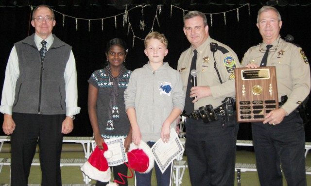 New Kent Elementary School (l to r) John Moncrief (principal), student winners Nekhita Kassey and Augustine Gilbride, Cpl. Kevin Watkins NKSO, and Deputy Steve Rula from Kip Kephart Foundation.