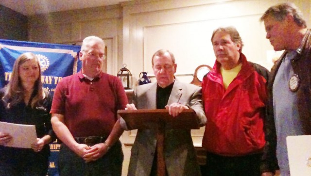 New Kent Rotary Club’s new members and their sponsors look on as club president Claude Carmack reads the charge of membership during the club’s Feb. 4 meeting. From left are sponsor Jackie Smith, new member Kenny Pace, Carmack, new member John Crump, and sponsor Kent Radwani. Crump, actually a lifetime member, took action to reafirm his membership.