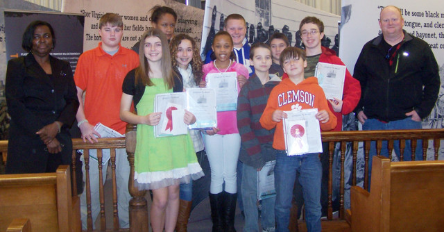 Some of the first, second, and honorable mention winners in the poetry, comic strip, and newspaper article categories pose with their prizes. They are flanked by New Kent Historical Society president Camilla Tramuel (left) and second vice-president Preston Martin.