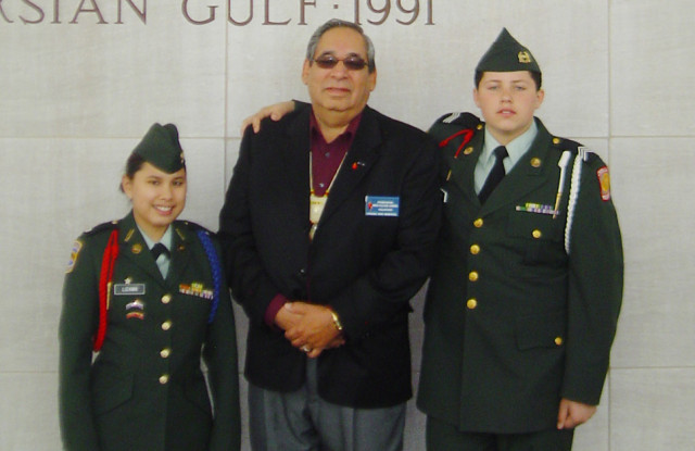 Charles City High School JROTC cadets Kelsey Lizama (left) and Colin Jones met Vietnam War veteran and Charles City native Powhatan Owen while attending a program at the Virginia War Memorial.