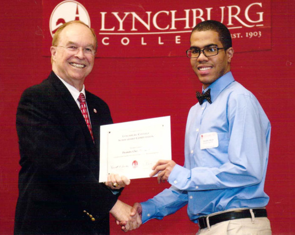 DeAndre’ Short (right) receives a certificate of participation in Lynchburg College’s scholarship competition from college president Dr. Ken Garren.