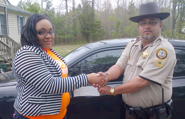 Taylor Smith, a senior at Charles City High School, receives a $500 check from Capt. Jayson Crawley of the Charles City County Sheriff’s Office for winning the Charles City portion of the 2013 Metro Richmond CrimeStoppers poster contest. Taylor’s poster also placed third place in the regional contest.