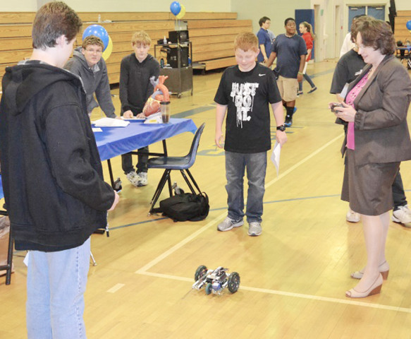Students at New Kent Middle School explored 15 fields of career opportunities at its annual career day held on April 26. Students filled questionnaires and enjoyed hands-on experiences with vendors, including seven local area businesses and organizations. Above, Ethan Godfrey (left) and Josh Dore admire a robot vehicle controlled by Margaret Best of Bridging Communities Career and Technical Center. Below, a group of seventh grade girls fill out questionnaires for VCU’s medical service psychology field.