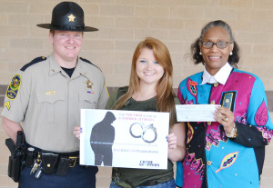 Ciara Evers (center), a junior at New Kent High School, is the winner of the 2013 Crime Stoppers Poster Contest for New Kent County High School. She was awarded a $500 check from Crime Stoppers. Presenting the check are Corporal Heath Jenkins (left) and high school principal Yvonne Jones (right).
