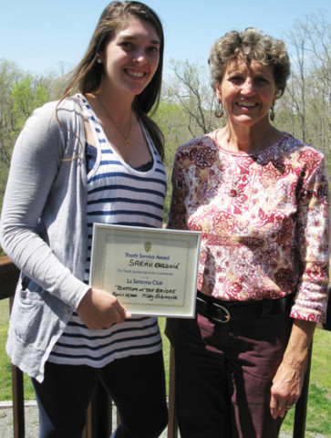 New Kent’s Sarah Baldwin (left) is the recipient of a $100 check as the Youth Service Award winner for Bottom of the Bridge LaSertoma. Awards chairperson Brenda Johnston presented the check.