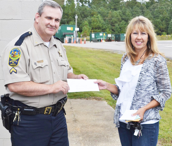 Melanie King of Proclaiming Grace Outreach (right) presents a $724.50 check to Corporal Kevin Watkins (left) and the New Kent Animal Shelter. The money was raised as part of the Jenna Bash festival, with proceeds donated to various charities.
