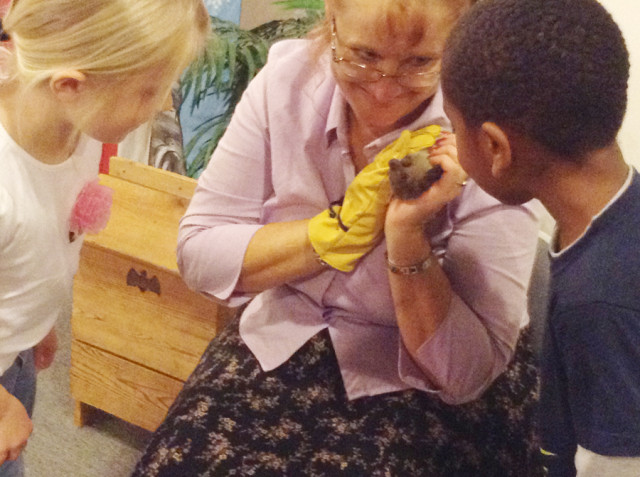 Madelyn Dzula, 6 (left) and Quentin Hepburn, 7 (right) look on as Denise Tomlinson of Bat World Hampton Roads talks about bats during her special “Stellaluna Storytime” presentation at Heritage Public Library on Oct. 12. The event, sponsored by Charles City-James City-New Kent-York Farm Bureau, received more than 50 participants.