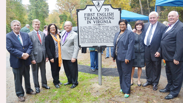 Gov. Bob McDonnell (second from left) was on hand for the dedication of the First English Thanksgiving historical marker near Berkeley Plantation last Friday in Charles City. The marker signifies that Virginia was the first location to have the holiday in the nation and depicts the significance of the occasion. Joining Gov. McDonnell are (l to r) Berkeley Plantation owner Malcolm Jamison, county representatives Denise Smith (commissioner of revenue), Gilbert Smith (District 1 supervisor), and Michelle Johnson (assistant county administrator), Mr. and Mrs. Graham Woodlief, and Dr. William C. Bosher Jr. Below, a closeup view of the marker displays the history of the first English Thanksgiving.Andre' Jones photos