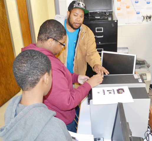 Bridging Communities Career and Technical Center and Charles City senior Peyton Winston (center, above) conducts a final inspection as part of the center’s computer donation program on Nov. 23. Twenty New Kent Middle School students with computer needs were recepients of refurbished devices provided through BCCTC and the Virginia Student Training and Refurbishment Program (VA STAR). Computers included cables, keyboards, Windows program, and 80 gigabytes of hard drive memory. Below, BCCTC director Dr. Stephen Trexler (left) helps load a cart to transport computers for estatic middle school students and families.