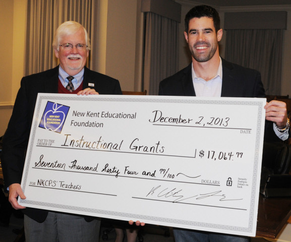New Kent school superintendent Rick Richardson (left) accepts a $17,064.77 check from New Kent Educational Foundation representative Christopher Lindsay during Monday’s New Kent School Board meeting. The amount has been awarded as instructional grants to New Kent teachers. In all, the foundation funded 28 grant requests that were forwarded to the group by county teachers.Alan Chamberlain photo