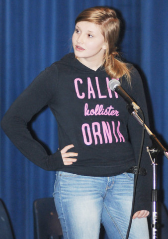 New Kent schools’ district spelling bee winner Bryanna Seay (top) ponders her next word from caller Ross Miller and (below) receives a dictionary as first prize from Miller. The eighth grader at New Kent Middle School won Wednesday’s bee in the ninth round by correctly spelling “diagnosis.” She advances to the state bee on March 8 in Richmond. New Kent Elementary fifth grader Dakarai Knorr finished as runner-up. At bottom, all nine contestants await the bee’s start. From left are Emily Peck (Gr. 4, GWES), Dana Douglas (Gr. 3, NKES), David Mantlo (Gr. 6, NKMS), Addison Chapman (Gr. 3, GWES), Knorr, Lauren Upton (Gr. 4, NKES), Seay, Kyle Peck (Gr. 7, NKMS), and Riley Baker (Gr. 5, GWES).Alan Chamberlain photos