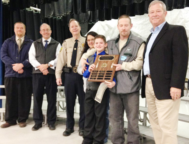 New Kent Sheriff’s Office presented three New Kent students with the Kip Kephart citizenship award. Each year a student from each elementary school and the middle school are recognized by school staff members in areas of good citizenship that includes good behavior and positive characteristics. Each winner receives a cash award, certificate, and name engraved on a plaque. Above, Julian Vogt of New Kent Elementary accepts the award. With him are (l to r) assistant principal David Baum, principal John Moncrief, Sheriff F.W. “Wakie” Howard, mother Shannon Vogt, father Jarret Vogt, and Steve Rula of Kip Kephart foundation.