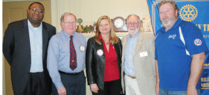 New Kent Rotary Club recently honored four new Paul Harris “Fellows,” at its March 31 meeting. Pictured are (l to r) Foundation Chairman Dwight Johnson, Wayne Hayden, Club President Jackie Smith, Assistant District Governor Frank Ferrante, and Kevin Eddowes. Not pictured is new Fellow Steve Dubosky. The organization recognized individuals who contribute $1,000 or more to the Rotary Foundation for humanitarian projects by honoring and accepting individuals into the “Fellows” club.