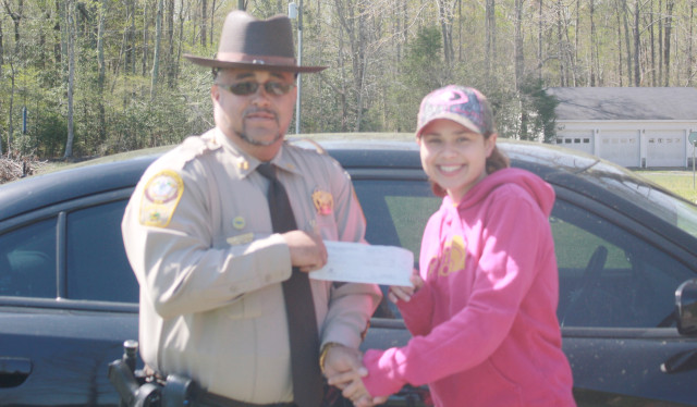 Captain Jayson Crawley (left) of Charles City County Sheriff’s Office presents a $500 check to eleventh grader Caylin Stewart (right) as Charles City’s poster contest winner sponsored by Metro Richmond Crime Stoppers. Stewart’s poster also placed fourth in the Richmond regional area.