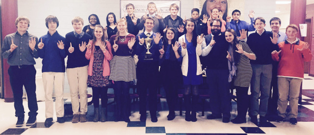 New Kent High School’s Scholastic Bowl team captured its sixth consecutive district title Wednesday night, completing an undefeated seasion with a record of 18-0. The team was led by Conner Barney, David Bushhouse, Caitlin McCaughan, Clare Morris, and Ian Schwegal. The team is coached by Matt Duckworth and moves on to conference competition.