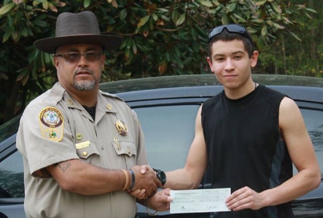 Zachary Barneycastle (right), a junior at Charles City High School, receives a $500 check from Captain Jayson Crawley of Charles City Sheriff's Office as the school's winner of the 2015 annual CrimeStoppers poster contest. Zachary's poster was selected out of 20 entries submitted.