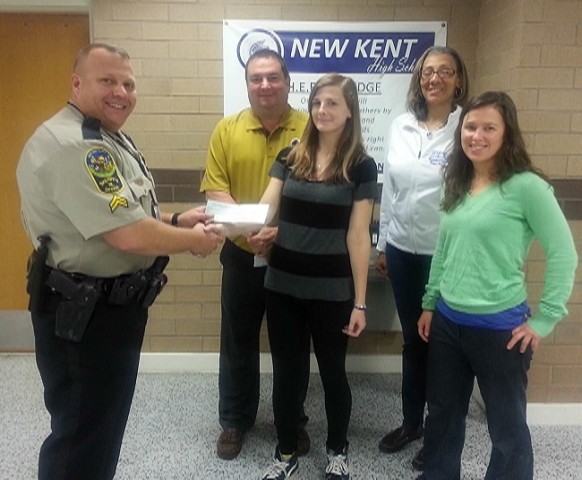 New Kent High School student Elizabeth Brewer accepts a $500 check from School Resource Officer Cpl. Jerry Simpson for winning the Metro Richmond Crime Stoppers poster contest. The annual contest invites Richmond area high school students to submit entries that reflect the Crime Stoppers program such as the crime tip phone number (780-1000) and that all callers remain anonymous. Looking on at the check presentation are (l to r) school principal Chris Valdrighi, assistant principal Wendi James, and art teacher Sarah Revell.Photo courtesy of New Kent Sheriff's Office