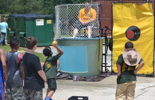 Above, Charles City Elementary School teacher of the year Andrew Merritt falls victim to the dunk tank as part of Charles City Elementary School's field day on Tuesday afternoon. Theme-based around Dr. Seuss books and stories, students participated in activities that included a "How the Grinch Stole Christmas" search for missing gifts. Below, students take a ride on an inflatable slide as part of the fun and games.Andre' Jones photos
