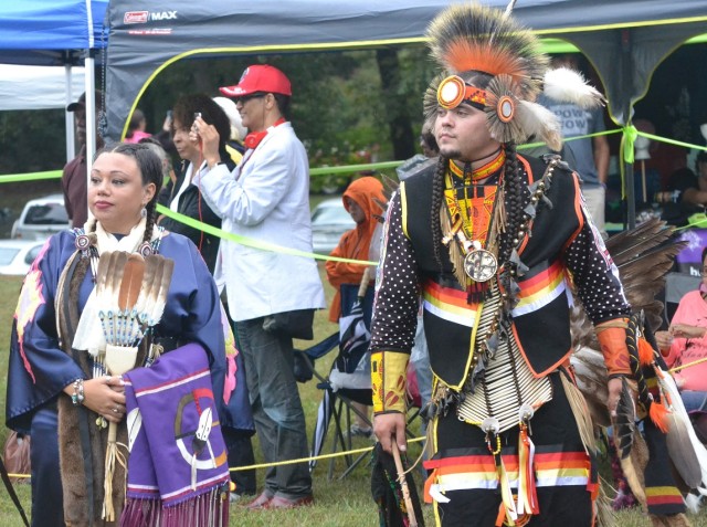 Head Female Dancer and Chickahominy Tribe member Ashton Montez (left) is joined by Head Male Dancer and member of the Haliwa-Saponi Tribe Will Richardson during grand entry as part of the 64th annual Chickahominy Pow-wow on Sept. 26-27 on the tribal grounds in Charles City. Rain couldn’t dampen the spirits as a large crowd joined in to witness and celebrate the annual festivities.