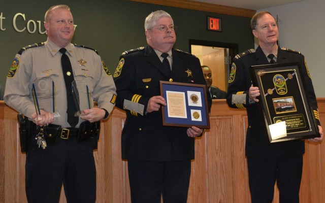 (L to R) Lt. Lee Bailey, Sheriff-Elect Joe McLaughlin Jr., and Sheriff Wakie Howard have their hands full after New Kent Sheriff's Office received a plethora of awards in recognition of their service to the county as part of the Chiefs of Police Law Enforcement Presentation Monday night at the board of supervisors meeting. Awards won by the department are the National Law Enforcement Award (1st), Virginia Law Enforcement Award (1st), Commonwealth's Award, and the Distracted Driving Prevention Award.Andre' Jones photo