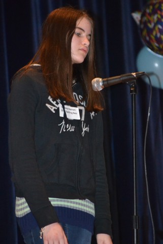 Above, Charles City seventh grader and district spelling bee champion Delaney Narron focuses in as the judges pronounce the final word at the Feb. 24 morning competition. Narron successfully spelled the word "fringe", outlasting a 27-round duel with sixth grader Sophia Hall in a competitive back and forth battle. Narron will move on to participate in the state spelling bee championship on March 12 in Richmond. Participating students in the district-wide spelling bee are (below, l to r) fourth grader Nyema Charity, fifth grader Hannah Fetter, sixth grader Sophia Hall, seventh grader Delaney Narron, and eighth grader Jada Jones.Andre' Jones photos