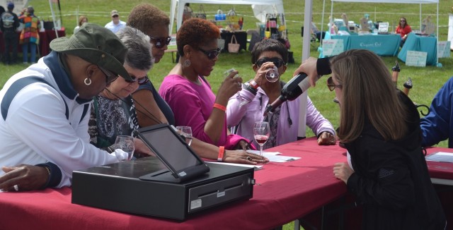 Above, patrons sample wine and review a menu of selections from New Kent Winery's table during Saturday afternoon's "A Taste of New Kent" festival sponsored by New Kent Chamber of Commerce. Approximately 1,000 people browsed through 10 winery stations and a number of vendors at the annual event filled with music, arts and crafts, and a variety of entertainment. Below, sculptor Ben Risney takes to a block of wood (left) and transforms it to a perched owl (right) as one of the many exhibits on display. For more photos of the festival, click on "Photo Gallery."Andre' Jones photos