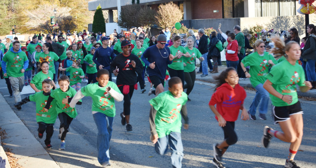 Kids and adults of all ages take off in one giant pack as part of New Kent’s Grand Illumination held Sunday afternoon in the courthouse complex. The event, now in its fourth year, serves as the primary kickoff of the holiday season for the county with activities that include lighting of the Christmas tree, pictures with Santa Claus himself (below), and caroling by groups such as the New Kent Stagehands (bottom).