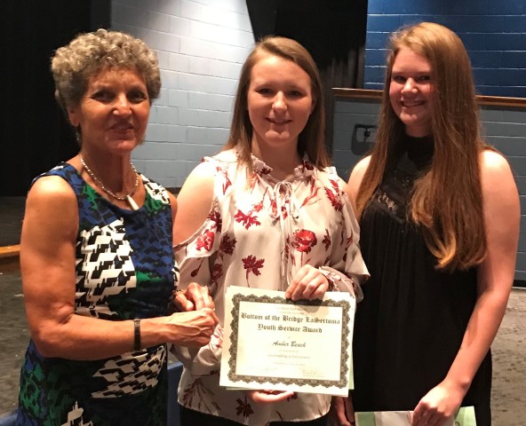 Recent New Kent High School graduates Amber Beach (center) and Macayla Hyndshaw (right) are the recipients of the Bottom of the Bridge LaSertoma grant. Beach received $2,000 in scholarship money and Hyndshaw was awarded a $1,000 scholarship at a May banquet. Presenting the scholarship is Bottom of the Bridge LaSertoma awards' chairwoman Brenda Johnston (left).